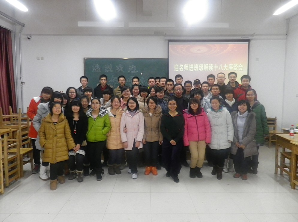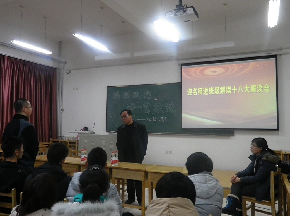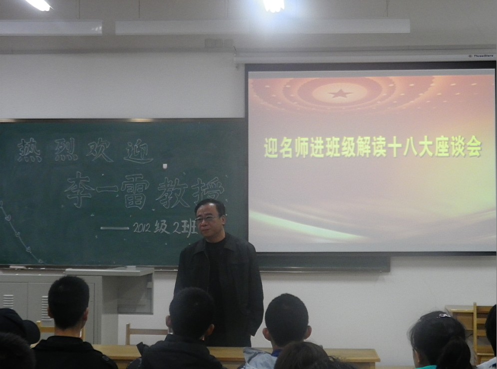 11月26日晚六点半, 白求恩医学院副院长、病理学系教授、701202班名师班主任李一雷与所带班级全体同学在中心校区李四光教学楼114教室开展“解读十八大精神,青春与祖国同行”主题班会。