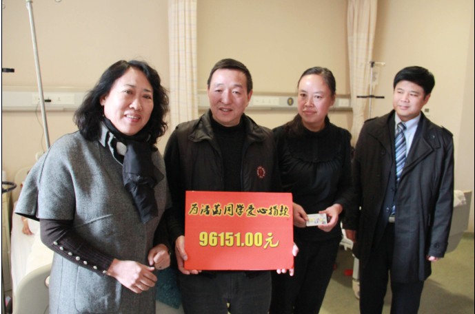 9月24日至10月23日,爱心募捐活动先后在中心校区、南湖校区、南岭校区以及新民校区相继开展。白求恩医学院各年级、各班级纷纷为潘菡进行捐款,2007级毕业生在得知潘菡的病情后,也自发组织募捐,将善款从祖国的大江南北汇集到白求恩医学院,贡献了自己的一份力量。此次募捐活动共持续一个月,在学院领导的倡议和指导下,在各级学生组织的积极宣传下,引起了全校师生的广泛关注和积极响应。截至目前,共募集捐款96151元,让身患重病的潘菡感受到了来自学校和师生的关心和温暖,让她重新燃起了对生命的希望。目前,潘菡已完成第二期化疗,病情正在积极控制和治疗中。 (学生记者:刘水)