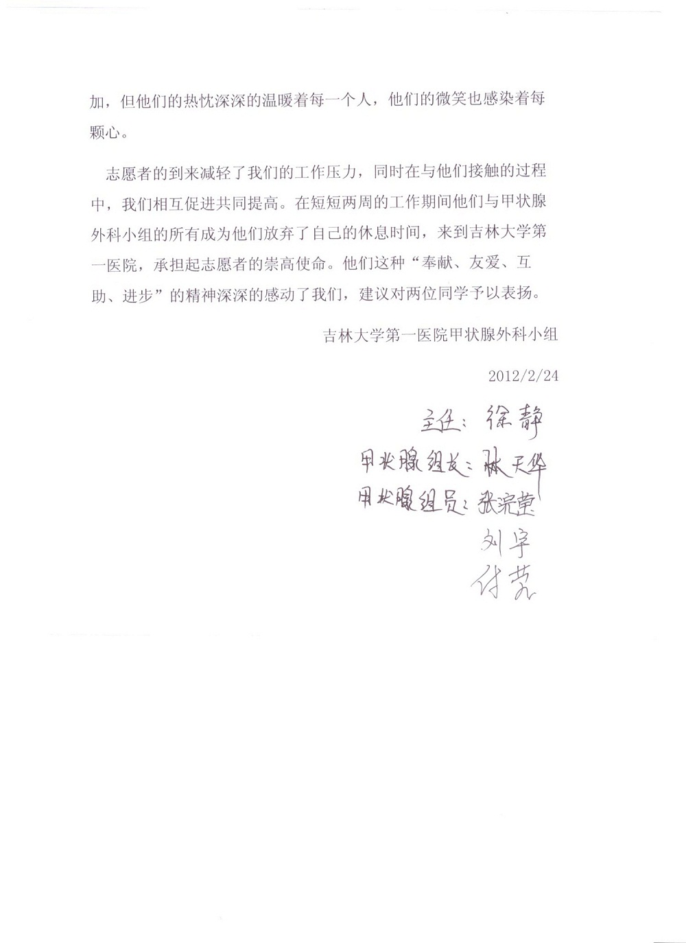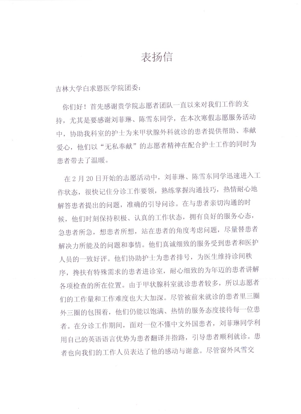 近日,白求恩医学院团委收到吉林大学第一医院甲状腺外科小组寄来的表扬信。对我院志愿者团队为吉林大学第一医院所做的志愿服务工作表示感谢,尤其是感谢701101班的刘菲琳同学和701002班的陈雪东同学,他们在寒假志愿者服务活动中协助科室护士为来甲状腺外科就诊的患者提供帮助、奉献爱心,以“无私奉献”的志愿者精神为患者带去了温暖。