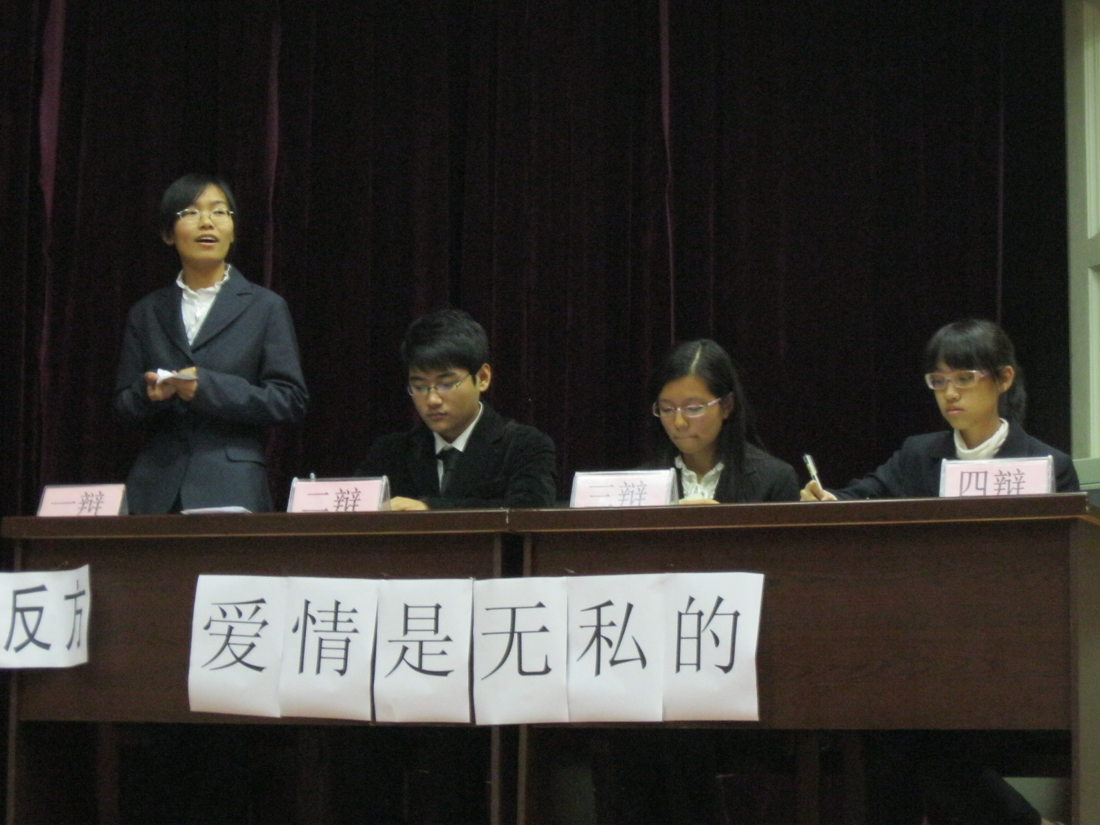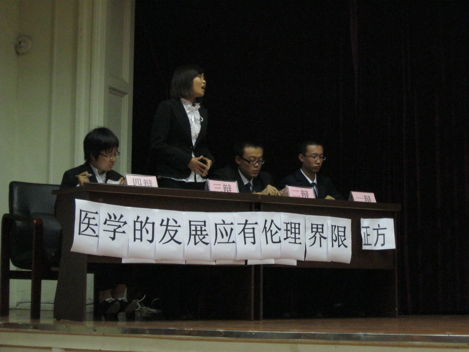 第一场比赛由701009班和701005班的辩手就“医学的发展是否应该有伦理界线”进行辩论。第二场角逐则是在701006班和701008班的辩手间就“爱情是自私还是无私”展开。场上辩手辩论激烈,沉着冷静。经评委合议,701006班获得了本次辩论的第一名。周全、于瑶、陆雨潇、刘海汀被评为最佳辩手。